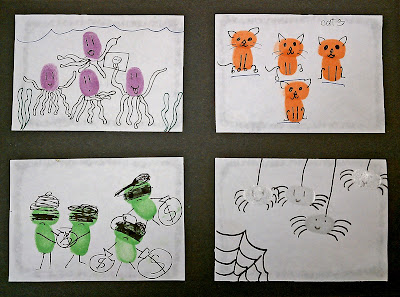 We took some time to learn about scientific flower illustrations in this lesson! I showed the class images of real botanical illustrations and discussed why they were made and what their use is. After talking about the illustrations, I had the kids sit down in front of many groups of different (and yes, real!) flowers. The students were to study the flowers and draw them with as much detail as they could. We didn't draw on regular paper but recycled news paper and book pages to evoke the antique feel of an old botanical illustration. The students drew the flowers in black crayon and drew a pattern in the background using a white crayon to begin the wax resist technique. Then the students painted in their flower pictures with watercolor paints. I had my older students do a bigger image on a piece of newspaper and my younger students made a group of 4 five in squares on the book pages. We then decoupaged them onto construction paper with Modge Podge!